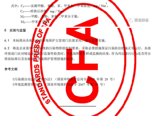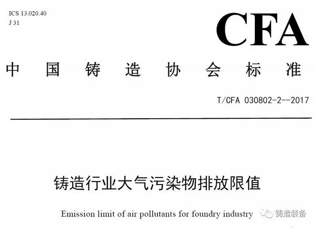 2017年7月31日,由中國鑄造協會發布的T/CFA030802-2—2017《鑄造行業大氣污染物排放限值》(中國鑄造協會標準公告 2017年 第06號)發布。該標準于2017年10月1日起實施。