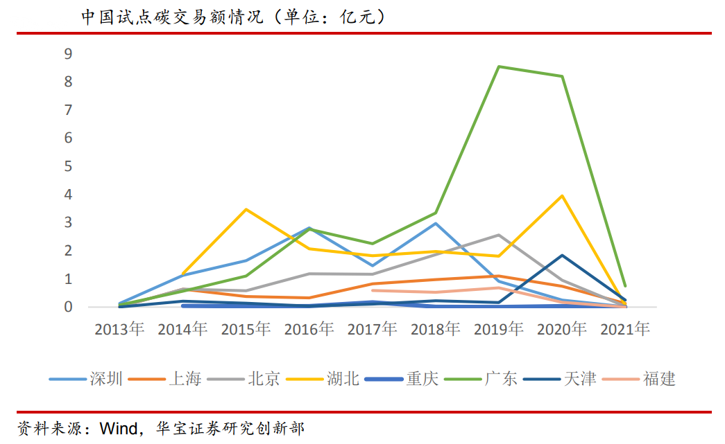 目前,全國共有8個地區(qū)在開展碳排放權(quán)交易試點(diǎn),包括:北京、天津、上海、重慶、湖北、廣東、深圳、福建。截至2020年11月,試點(diǎn)碳交易市場累計配額成交量約為4.3億噸CO?e,累計成交額近100億元人民幣。