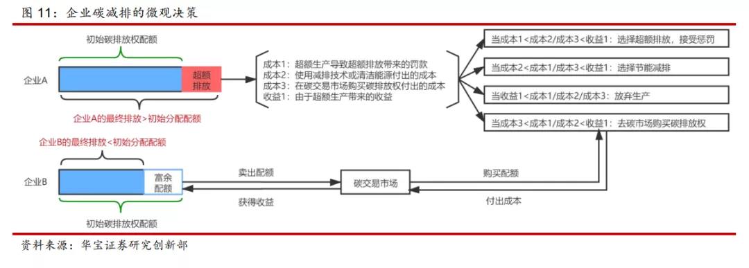 按照華寶證券的分析,有效碳市場(chǎng)的碳排放權(quán)的價(jià)格就是企業(yè)的邊際減排成本。在企業(yè)微觀決策上,主要是將碳減排成本、超額碳排放成本、購(gòu)買碳配額的成本與超額排放生產(chǎn)帶來(lái)的收益進(jìn)行比較,并作出相應(yīng)決策。