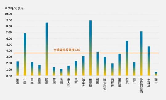 2019年全球GDP前20名國家的碳排放強度