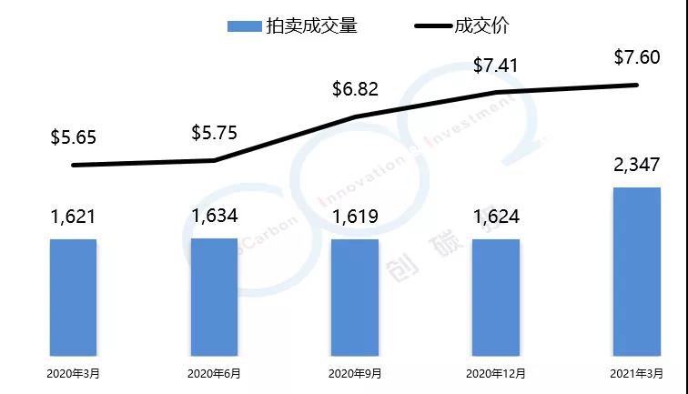 RGGI碳市場的初始配額發(fā)放以拍賣為主,每個季度舉行一次拍賣。2021年第一季度拍賣成交均價為$7.60美元,較上一季度漲幅為2.5%。由于弗吉尼亞州的加入,RGGI總成交量創(chuàng)歷史新高,達到了2347萬噸。以下是由中創(chuàng)碳投統(tǒng)計的RGGI近一年的交易情況。