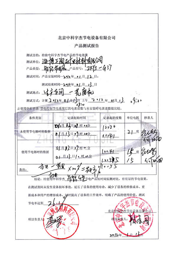 經過我們公司工程師的分析,有較大的節電空間,經測試安裝,幾臺設備的節電效果分別達到21.7%、25.9%、26.1%和40%。投資回報期1.5年。