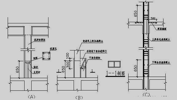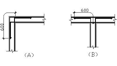 3 支承在懸臂板上的抗裂柱,與梁同標(biāo)高部位應(yīng)與梁同時安裝模板、鋼筋和澆筑混凝土,如圖3.6.1節(jié)點(diǎn)①、②所示。