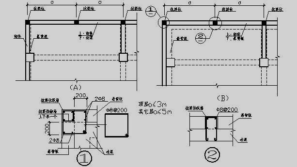 1 抗裂柱截面不宜大于墻厚×0.2m、或墻厚×窗間墻長度。拉結(jié)筋設(shè)置同結(jié)構(gòu)柱,縱筋不小于4φ12,縱筋中心間距不大于0.2m,縱筋搭接長度不小于0.6m,上下樓層交接處縱筋應(yīng)連續(xù)貫通,端部進(jìn)入基礎(chǔ)梁或屋面梁的錨固長度各不小于0.5m,箍筋φ6@200,縱筋搭接范圍內(nèi)箍筋間距減半。