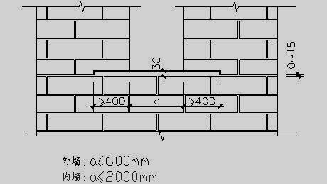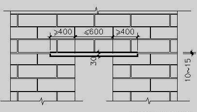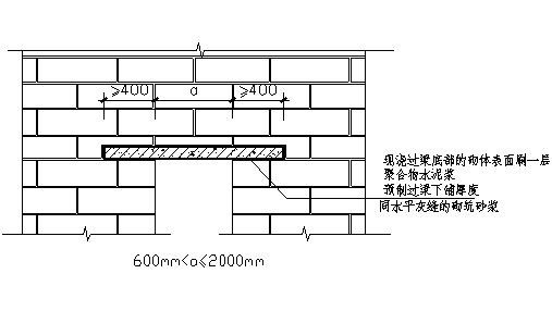 3.6.7 洞頂未設(shè)置主體結(jié)構(gòu)水平構(gòu)件處,當(dāng)洞頂凈寬大于0.6m但不大于2m時,宜在洞頂處設(shè)置預(yù)制或現(xiàn)澆C20的鋼筋混凝土過梁。過梁的截面尺寸及配筋按設(shè)計(jì)計(jì)算確定,混凝土強(qiáng)度等級不宜低于C20,兩端伸進(jìn)砌體內(nèi)各不小于0.4m,如圖3.6.7所示: