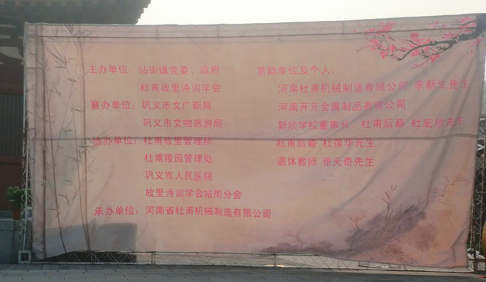 201444日清晨,由我公司-河南省杜甫機械制造有限公司為承辦單位的“第二屆清明文化節(jié)祭拜詩圣杜甫典禮”在鞏義市站街鎮(zhèn)杜甫故里紀念館中隆重舉行。此次祭拜詩圣典禮是繼2013年后的第二屆祭拜詩圣活動。是由站街鎮(zhèn)黨委、政府以及杜甫故里詩詞學會主辦,杜甫故里管理所等單位協(xié)辦的。