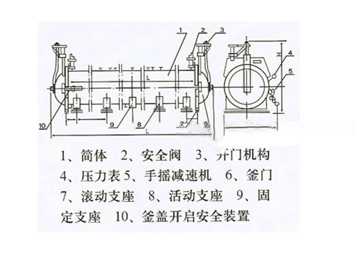 蒸壓釜設備主體部分主要由釜體裝置、覆蓋裝置、擺動裝置、手搖減速器、安全裝置、支座、保溫層、密封裝置、管道閥門儀表等組成。附屬部分包括排水裝置。 1. 釜體裝置:主要由筒體和釜體法蘭焊接而成。沿法蘭圓周均布嚙合齒與釜蓋法蘭均布的相應的齒相嚙合。釜內底部鋪設軌道,可行走或停放蒸養小車。釜體外側布置各種管座和接管、供進、排蒸汽、排放冷凝水和安裝各種儀表、閥門之用。 2. 釜蓋裝置:主要由釜蓋法蘭、齒板、圓頂封頭焊接而成,通過吊柄和短軸將覆蓋懸吊于相嚙合,起關閉蒸壓釜的作用。
